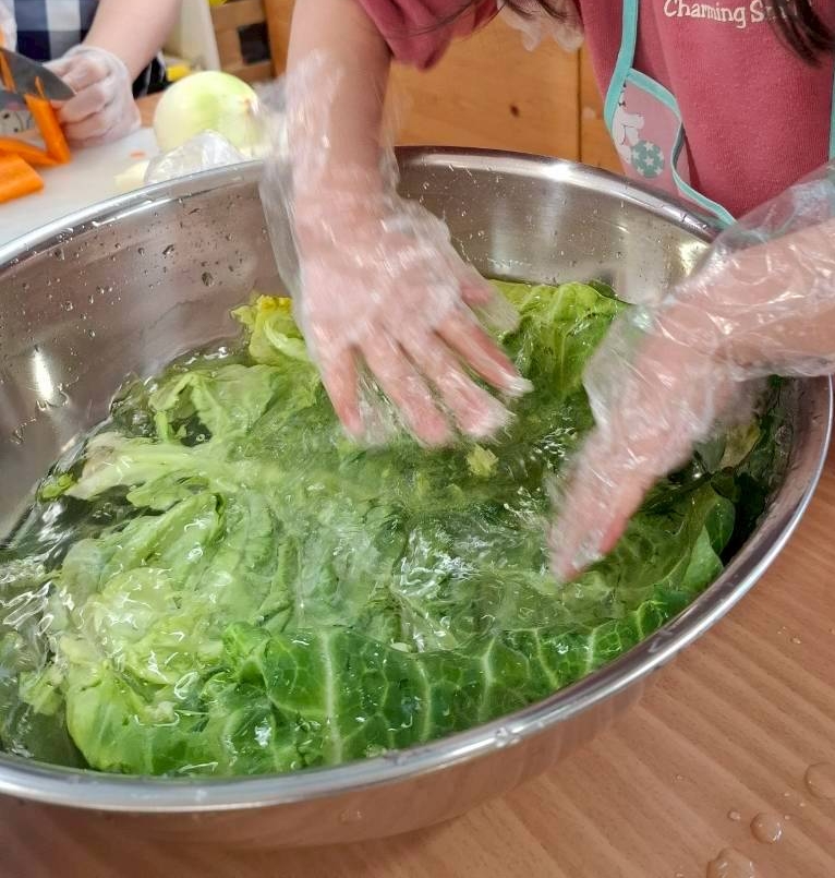 「これは?」と尋ねると「たまねぎ!」英語で「onion!」の声。「玉ねぎについているこれは?」「ねっこ!」「そう、スターさんは根っこのことよく調べてたよね」すぐに「触ってみたい!」と子どもたち。「今日は玉ねぎの皮と、キャベツを剥いてもらえるかな?」「やるやる!」「玉ねぎどうやるの?できない〜」「(キャベツの外側の葉)大きい!見てすごい!」両手で持ちまじまじと観察していました👀キャベツは剥けば剥くほど剥がれ難く「かして、ぼくが!」と夢中になってやってみる子どもたちでした。