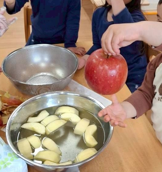 「みんなが食べてるリンゴ。切る前のリンゴはこれだよ」「リンゴについてるこれはなに?」「・・・?」「木についてるとこ!」「触ってみたい!」「皮をむいたら…」「においする!」あらためてリンゴの皮に鼻を近づけて集中する子どもたち。